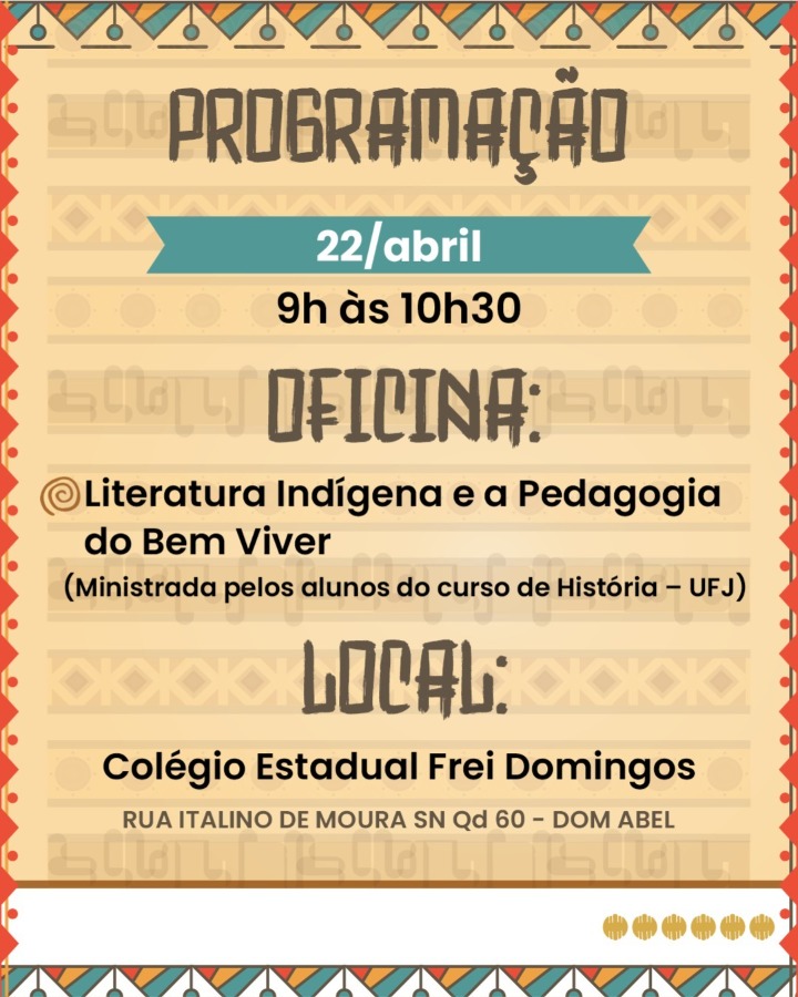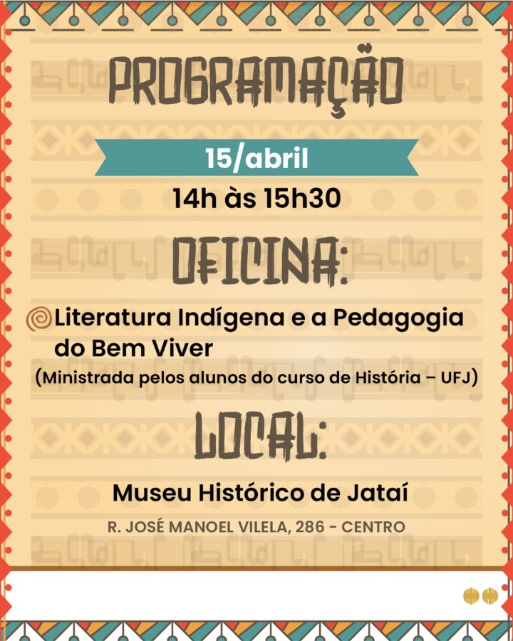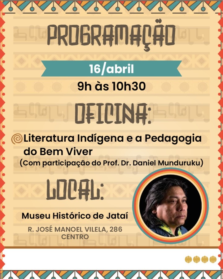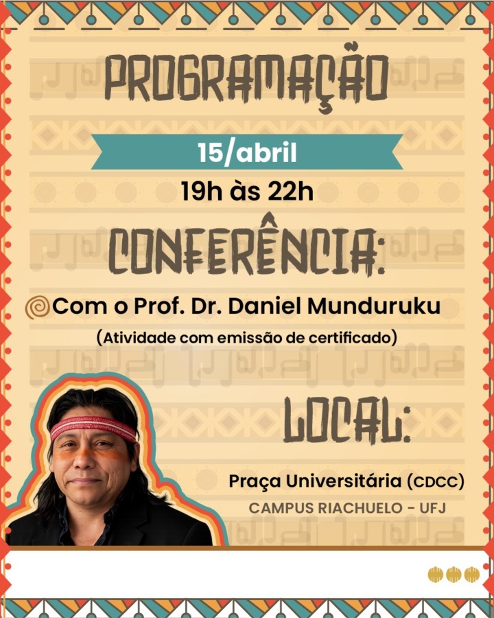Na programação, oficinas ministradas pelos alunos do curso de História da UFJ, além da conferência principal com o professor Daniel Munduruku, marcada para abertura do evento, uma atividade que conta inclusive com emissão de certificado.