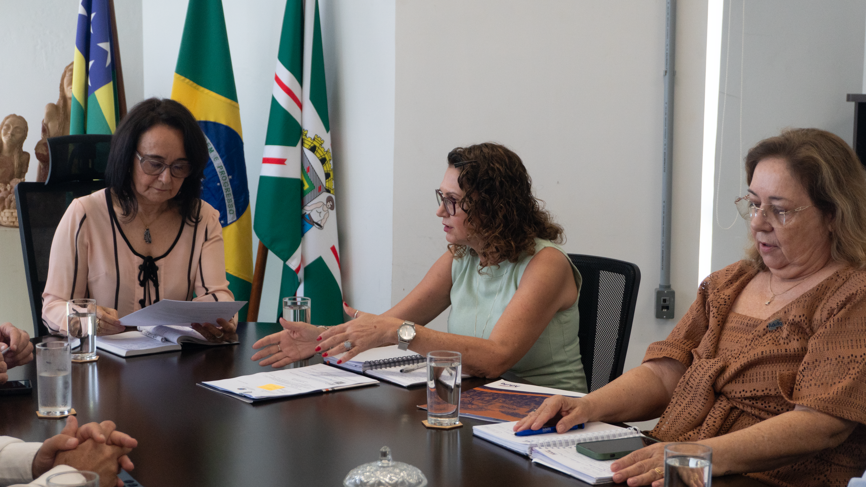Participaram da reunião a presidenta do sindicato, professora Geovana Reis, o 1º vice-presidente, professor Humberto Carlos Ruggeri Júnior, a diretora secretária, professora Marilda Shuvartz, e o diretor de Convênios e de Assuntos Jurídicos, professor Tertius Lima. O documento foi entregue à reitora da UFG, professora Sandramara Matias Chaves.