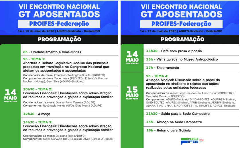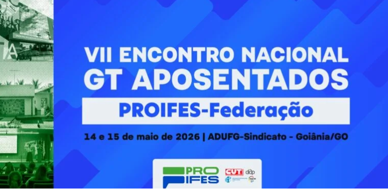 O Adufg-Sindicato sediará, nos dias 14 e 15 de maio, o VII Encontro Nacional do Grupo de Trabalho (GT) de Aposentados do Proifes-Federação. O evento reunirá docentes de instituições federais de ensino de todo o país para debater pautas relevantes para o público aposentado. As inscrições já estão abertas e devem ser realizadas por meio de formulário online clicando aqui.
